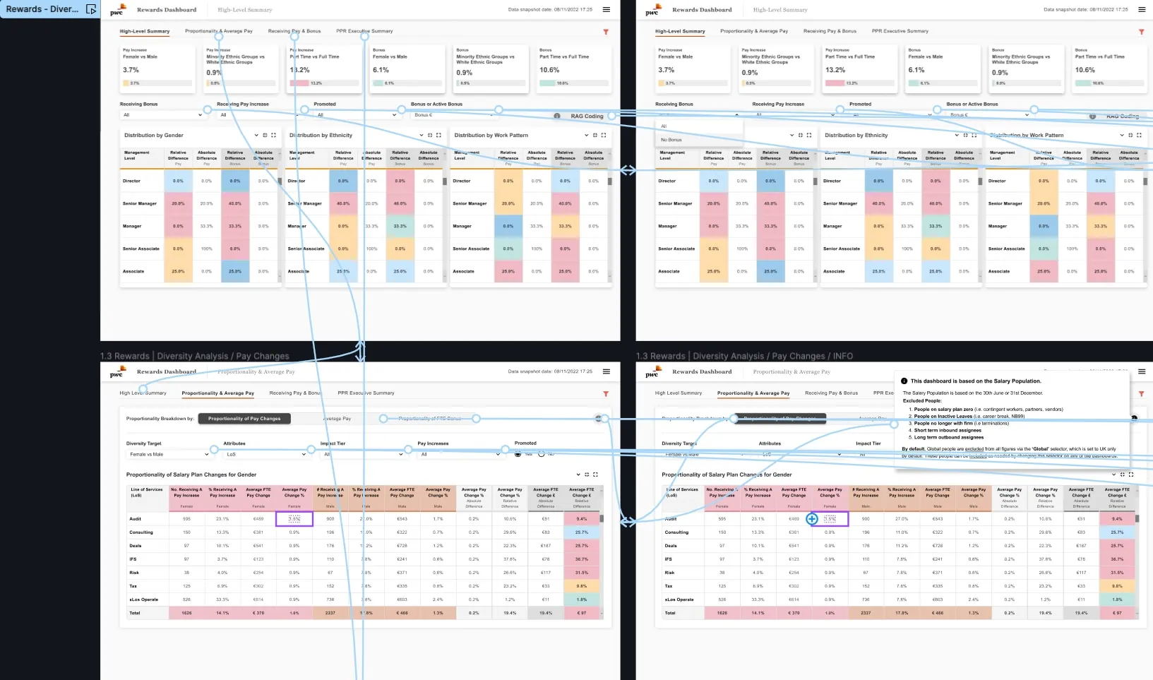 Revamp and elevate the user experience of PwC Financial’s financial dashboards by transforming outdated MicroStrategy interfaces. The primary focus is on delivering enhanced accessibility, streamlined data reading, and enriched visual data and reporting capabilities. Tailor the redesign specifically for High-Level Executive and Line of Service (LoS) Summaries, Impact Tier Distribution, Diversity Analysis related to Pay and Bonus, and other internal dashboards essential for HR, Management, and Executive functions.