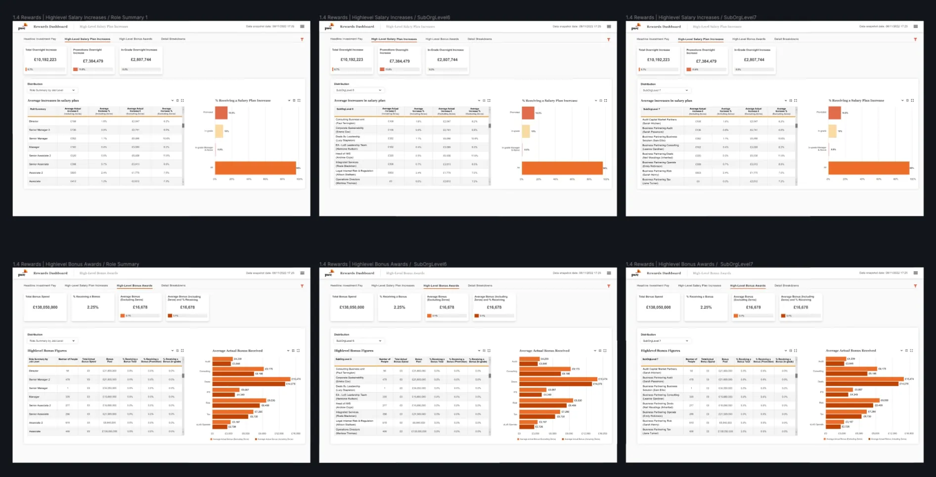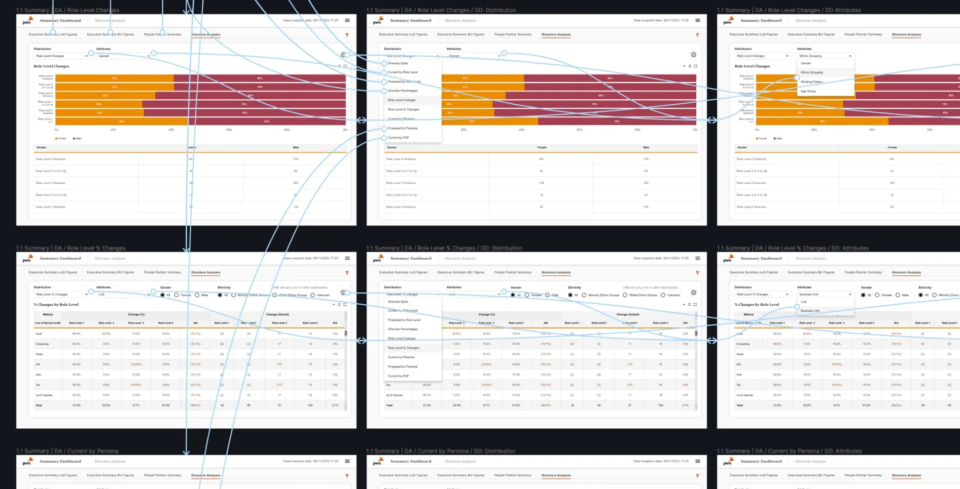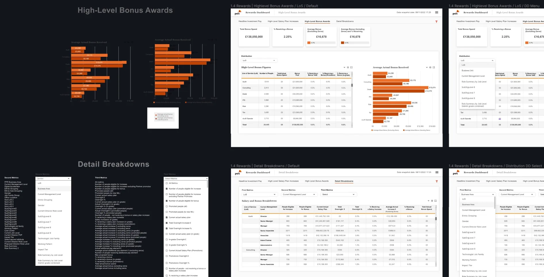 Revamp and elevate the user experience of PwC Financial’s financial dashboards by transforming outdated MicroStrategy interfaces. The primary focus is on delivering enhanced accessibility, streamlined data reading, and enriched visual data and reporting capabilities. Tailor the redesign specifically for High-Level Executive and Line of Service (LoS) Summaries, Impact Tier Distribution, Diversity Analysis related to Pay and Bonus, and other internal dashboards essential for HR, Management, and Executive functions.