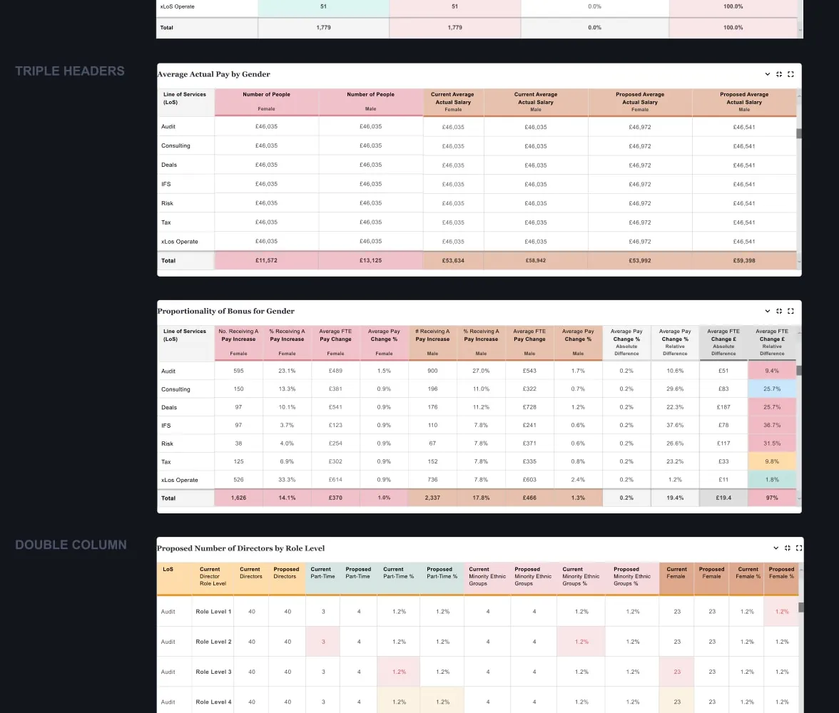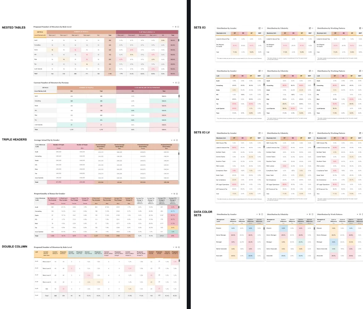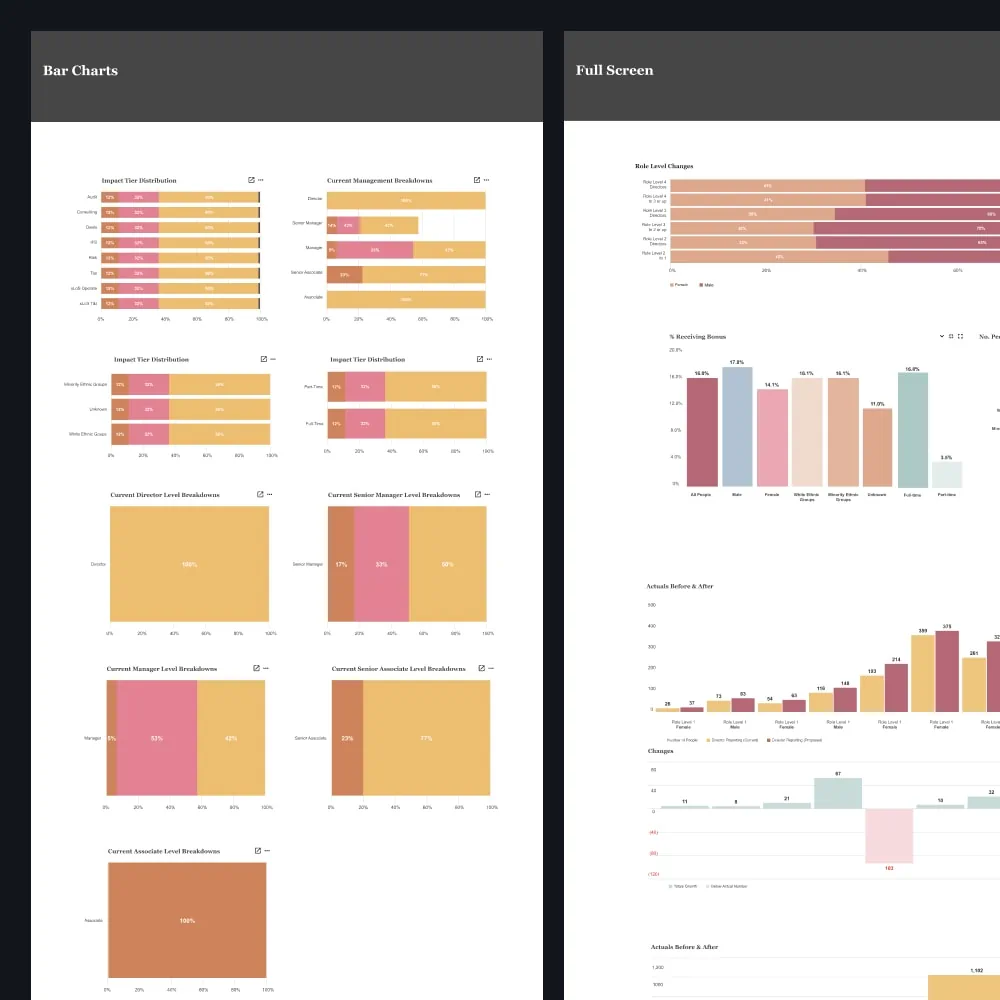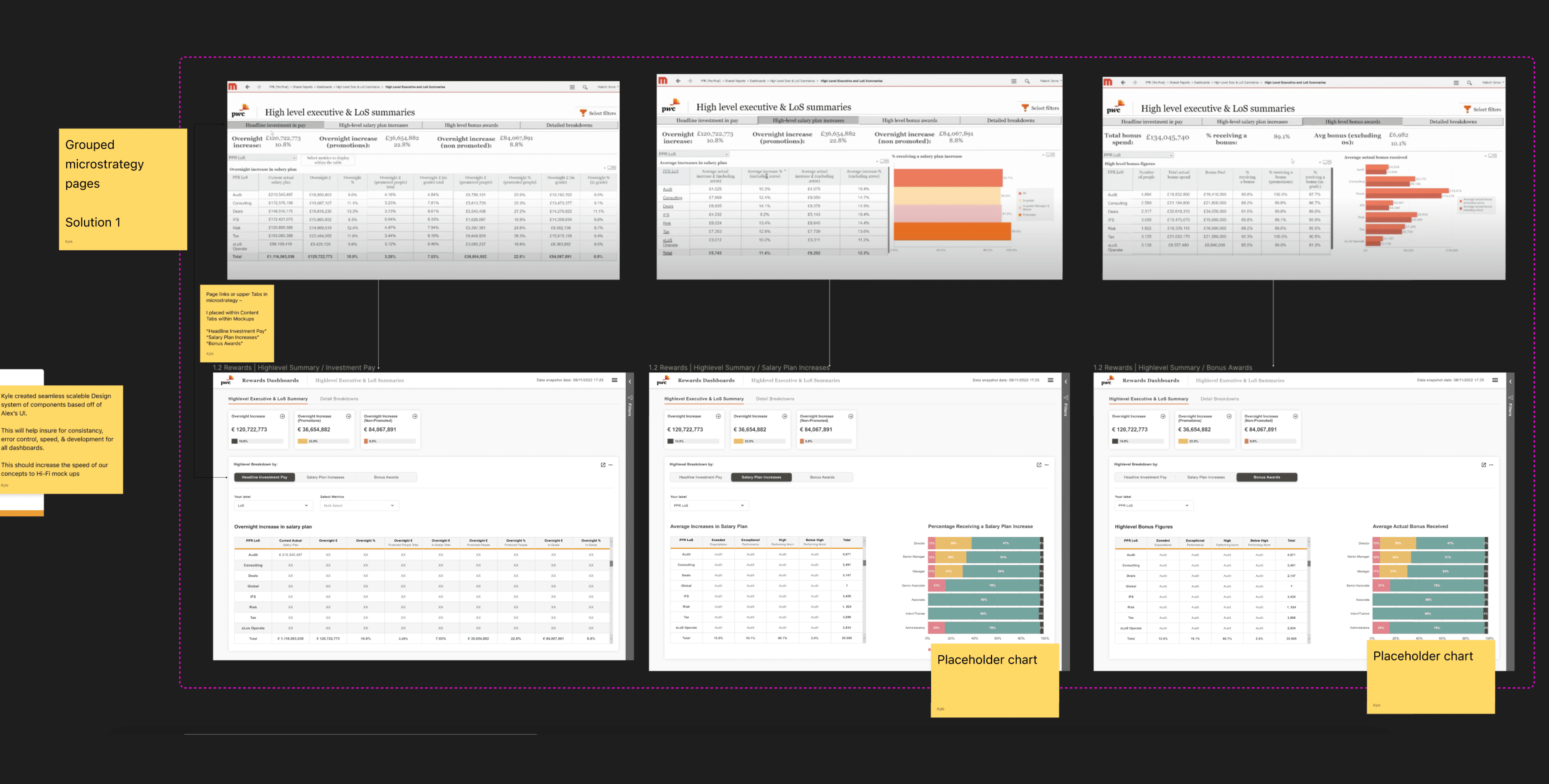 Revamp and elevate the user experience of PwC Financial’s financial dashboards by transforming outdated MicroStrategy interfaces. The primary focus is on delivering enhanced accessibility, streamlined data reading, and enriched visual data and reporting capabilities. Tailor the redesign specifically for High-Level Executive and Line of Service (LoS) Summaries, Impact Tier Distribution, Diversity Analysis related to Pay and Bonus, and other internal dashboards essential for HR, Management, and Executive functions.